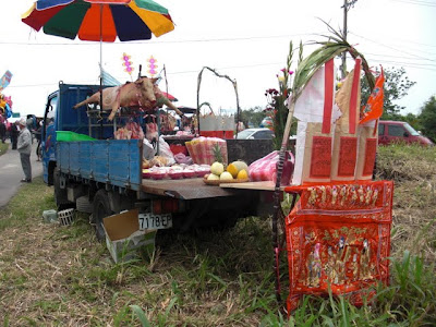 「我曾經參加過醫藥之神的大祭會,有200隻豬作為祭禮,那是在該神的生日舉行的,祂的偶像被放在淡水之北五哩,一個小平原的一所小茅屋之中,神像前陳列著豬肉、雞肉、魚、蛋、茶及酒。有個道士,唸咒,鞠躬,唱歌,求神降臨享受祭品,同時點起芬芳的香,並時時焚化紙錢。在茅屋外許多人忙著準備供神的盛筵,有200隻豬披著紅衣,擺在木架上排列成行,每隻豬的口中放著一個橘子,項背上插著一把刀,豬的重量50-480磅,足有4000人參加這個祭會。每個人家都獻出其祭品,以期獲得最好的福利。晚上還有火炬音樂及演戲等娛樂,以崇奉那位放在茅屋裡的可憐的樟木偶像。」馬偕(台灣遙寄)。