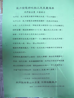 今天看夾報有財團要在三芝蓋風力發電的風車,標題很聳動很不幸這是真的,我可以同意以風力發電的效率、財團投資的效益、乾淨的環保發電等議題都是可以被討論的。可是事實上的情形是,風車不是三芝才有,台灣已經有上百座了吧!(我在路邊看的到的概估),沒必要為了那些喜愛看風車的人,花好幾億元再次的毀掉三芝的景觀,何況石門鄉已經有了好幾座,那裡的位置比三芝還好,所以在三芝會有多少觀光效益?這是絕對想的到的。通過環評我可以接受因為我們的環評裡面沒有「視霸」的觀念,至於產生的噪音有多大,只要去石門的風車底下聽一下就知道了,相信沒有人想要聽第二次,而且我敢保證那種「不怕死做你來的聲音」畢生難忘。另外對鳥類的影響,很難評估,不過在候鳥遷徙的路線上蓋具有極端危險的建物,絕對不是一件好事,阿彌陀佛,先幫那些可能遇害的鳥靈說對不起啦。對不起說錯了,看到幾隻會動的怪獸就被嚇跑了,當鳥是當假的。