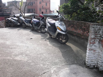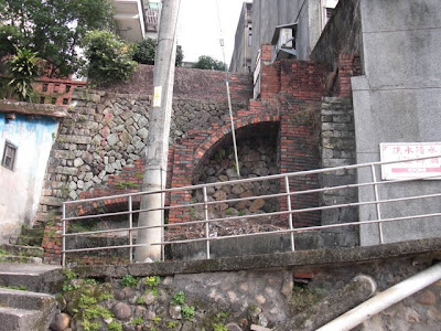 這個雙圓拱造型的路崁,是重建街的代表作,應該算是是地標之一吧!還有一個是大石頭。唯一的缺憾是前面的電線竿,很奇怪啦!在廟後的木頭電線竿很有古樸味,這裡就覺得很礙眼。其實也不是,只是拍照的時候擋住了,後面的路崁,記得這條通往祖師廟的小路是沒有欄杆的。