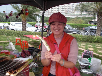 今天總算是沒下雨,天陰陰的有點涼。每年的水車文化節都是在賣吃的,今年也不例外。不過有一攤烤茭白筍還真有特色。因為他用自製的香椿醬,果然是味道特殊,非常對味,值得推薦。